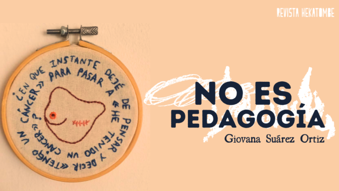 A veces siento que lo que irrumpe no es mi enfermedad sino el miedo de los otros. Como si yo acabara de anunciar algo excepcional, como si los demás no se fueran a morir también. Annie Ernaux escribe en El uso de la foto “¿En qué instante dejé de pensar y decir ‘tengo un cáncer’ para pasar a ‘he tenido un cáncer’?” (167), esa frase la tengo bordada en un tambor de costura y también escrita en el calendario de mi baño donde marco las pastillas que tomo para bloquear los receptores de estrógeno y progesterona, pastillas para que no vuelva. Volvió. No sé si volvió siendo más agresivo, el caso es que volvió; la primera vez, en 2021, el informe decía: “carcinoma ductal infiltrante”, “receptores de estrógeno positivos en el cien por ciento de las células neoplásicas”, “receptores de progesterona positivos en el cien por ciento”, “HER2 negativo”, “Ki67 del seis por ciento”, “Grado histológico Nottingham uno de tres”. Recuerdo que la palabra que me atravesó fue carcinoma, no el porcentaje, no la estadística. Carcinoma.